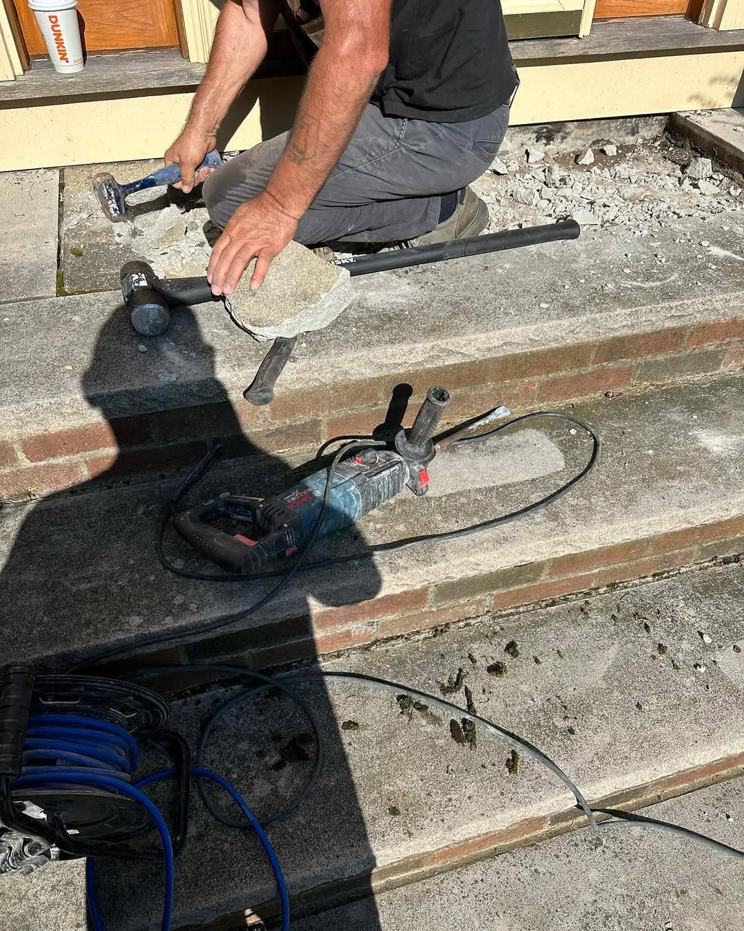 In this project, we were tasked with restoring and revitalizing the front porch and staircase of a residential property. The existing concrete steps had become worn, cracked, and outdated, detracting from the home’s overall appearance and safety. Our first step involved the careful demolition and removal of damaged materials while preserving the structural integrity of the base. Special attention was given to maintaining clean edges and protecting surrounding landscaping during the process.